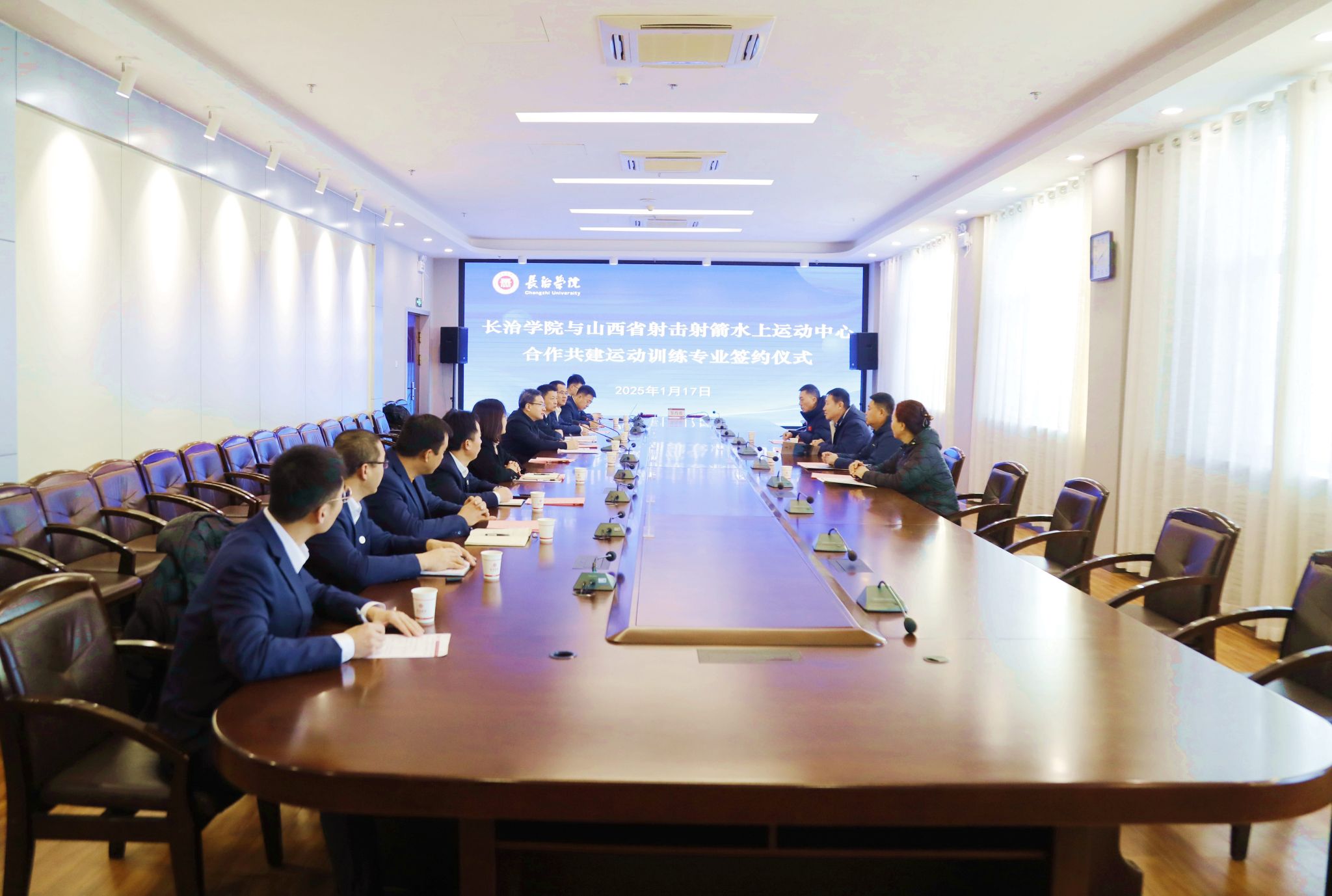 1月17日,我校与山西省射击射箭水上运动中心共建运动训练专业签约仪式在北校区2号会议室举行。党委委员、副校长王志军,山西省射击射箭水上运动中心主任武永胜出席,双方相关人员共同参加签约仪式。