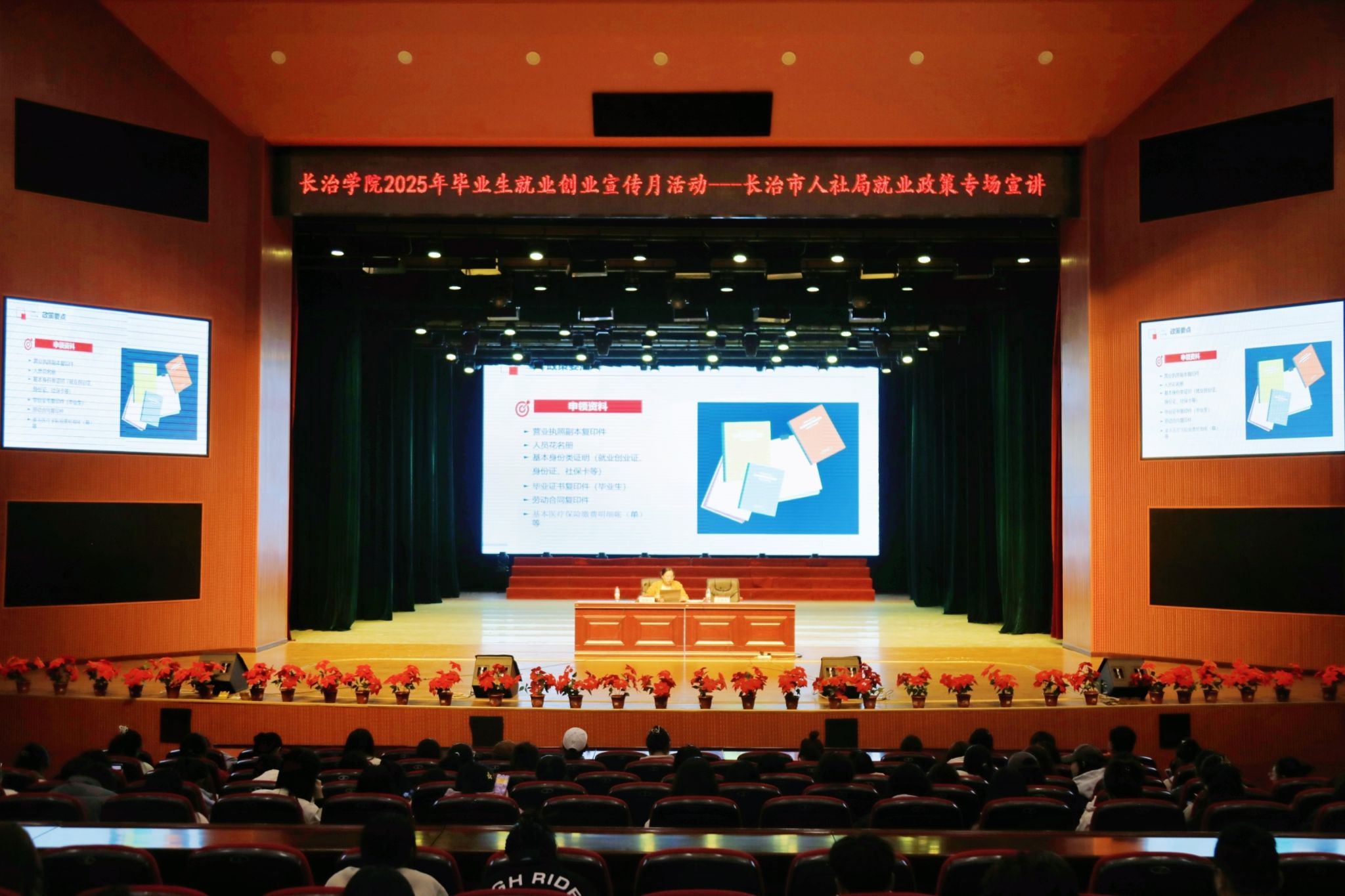 会上,长治市人社局人事人才发展中心副主任王飞、潞州区人社局就业管理和人才交流服务中心副主任张淑芬通过实际案例和详实数据,深入分析了当前就业市场的现状,让同学们对未来的职业发展有了更加直观的认识。他们讲解了求职创业补贴、基层就业补贴、就业见习、创业担保贷款、创业培训补贴、大学生创业园入驻优惠政策等一系列针对高校毕业生的利好政策,并详细说明了各项政策的申报条件、申请流程以及所需材料,帮助毕业生充分了解各项促就业优惠政策,确保现场师生能听得懂、用得上。