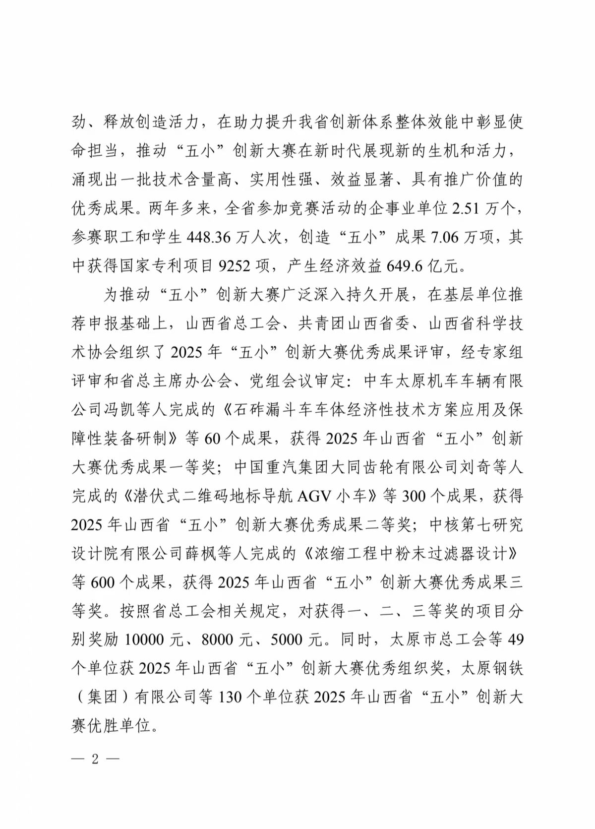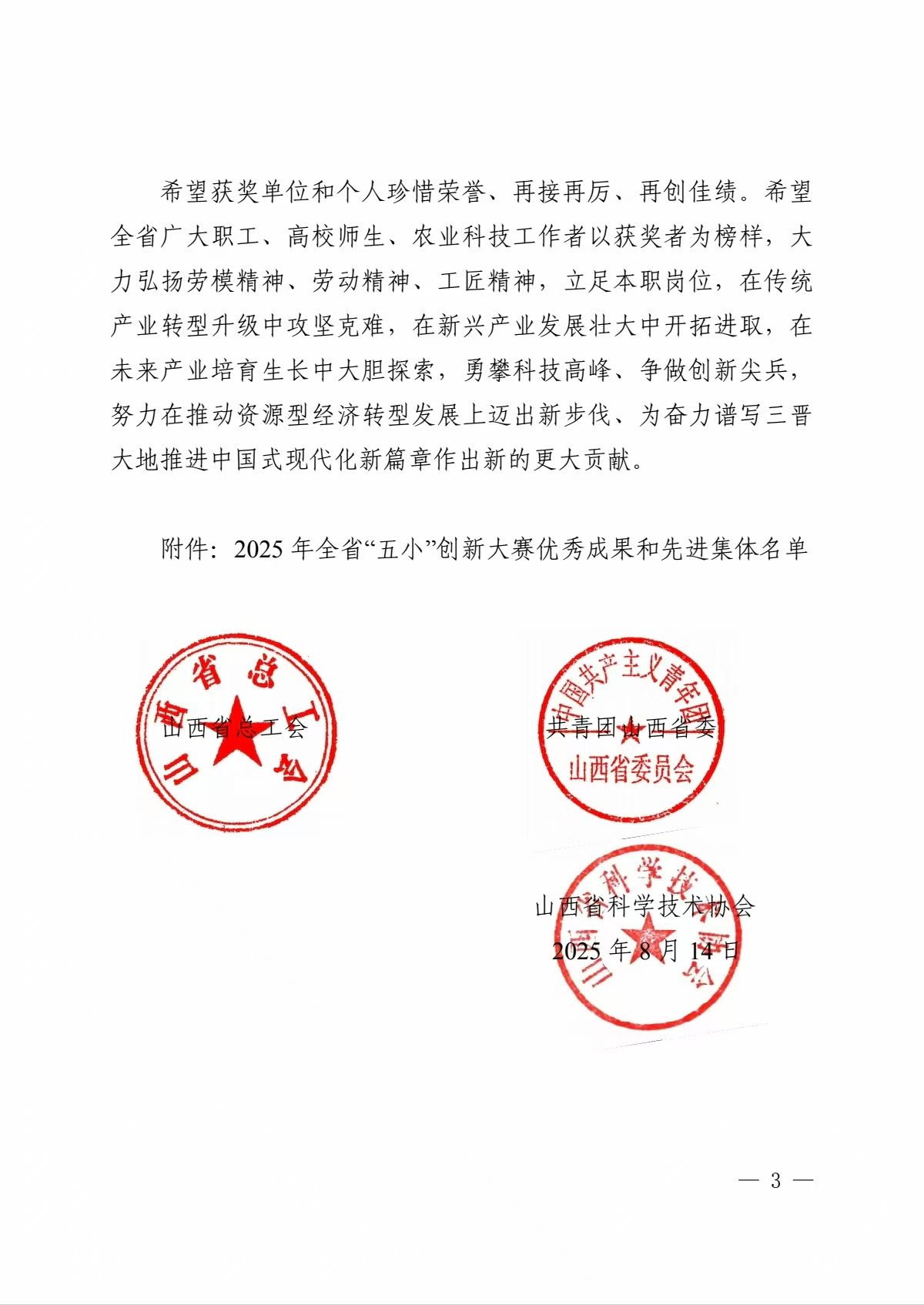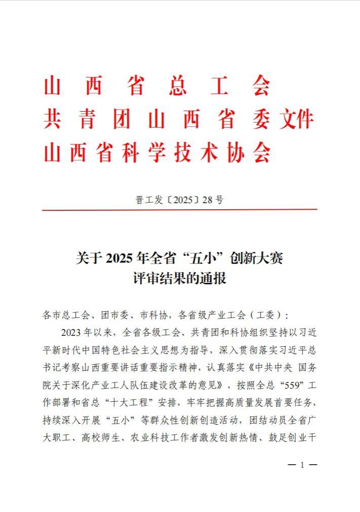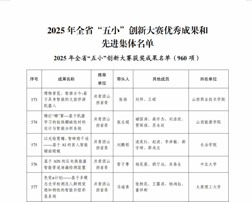 近日,山西省总工会、共青团山西省委和山西省科学技术协会发布《关于2025年全省“五小”创新大赛评审结果的通报》(晋工发〔2025〕28号),我校物理系参赛作品《以光绘慧瞳,智眸感千途——基于AI的盲人智能辅助眼镜》荣获2025年全省“五小”创新大赛优秀成果三等奖,实现了我校在该赛事上零的突破。